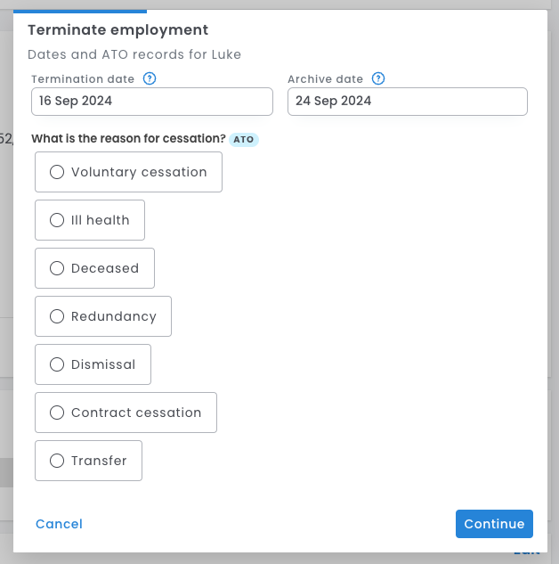 - Cessation reason - Select from the ATO-specified cessation reasons. This reason will be included in the STP packet sent to the ATO.