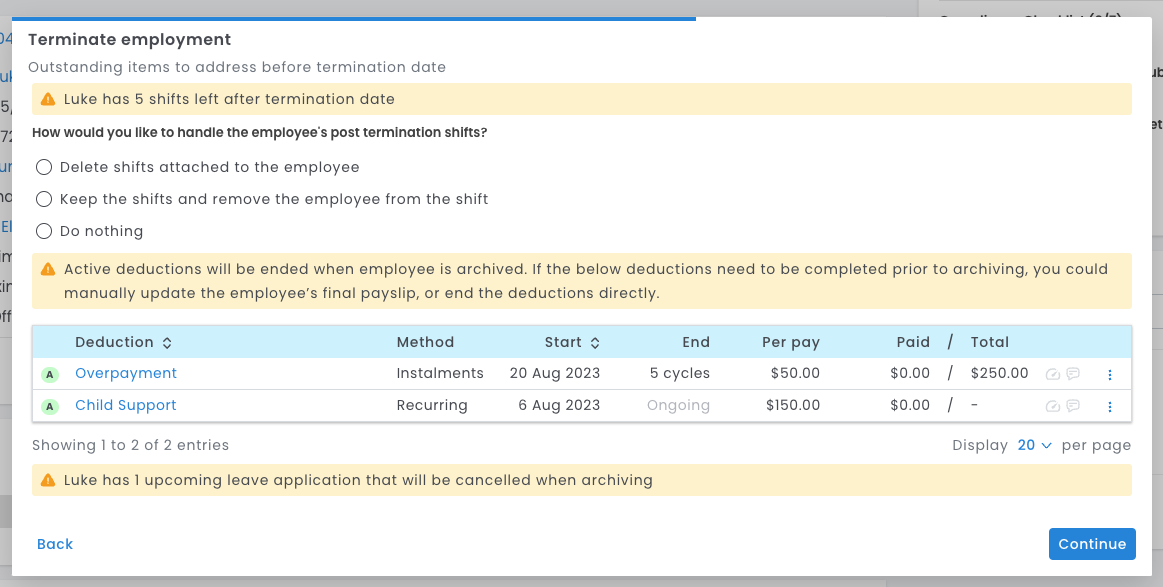 - If the employee has any shifts, leave, or deductions after the termination date, you will be asked how you would like to handle these. Make your selection and press Continue.
