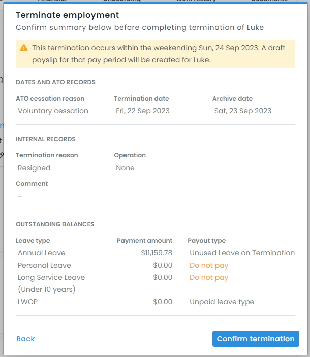 Lastly, you will review the termination details. If any details are incorrect, select back and edit them. Once you are happy with the details, select Confirm termination.