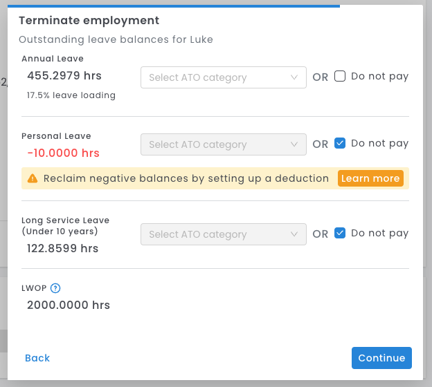 - If your employee has a negative leave balance, you will be notified at this stage. To reclaim this balance, a deduction will need to be applied to the employee's final payslip.