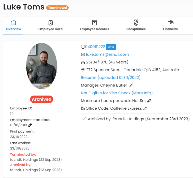 In the example below, you can see that Luke is both Terminated and Archived. He was terminated by foundU Holdings on 22 September and was archived the next day.
