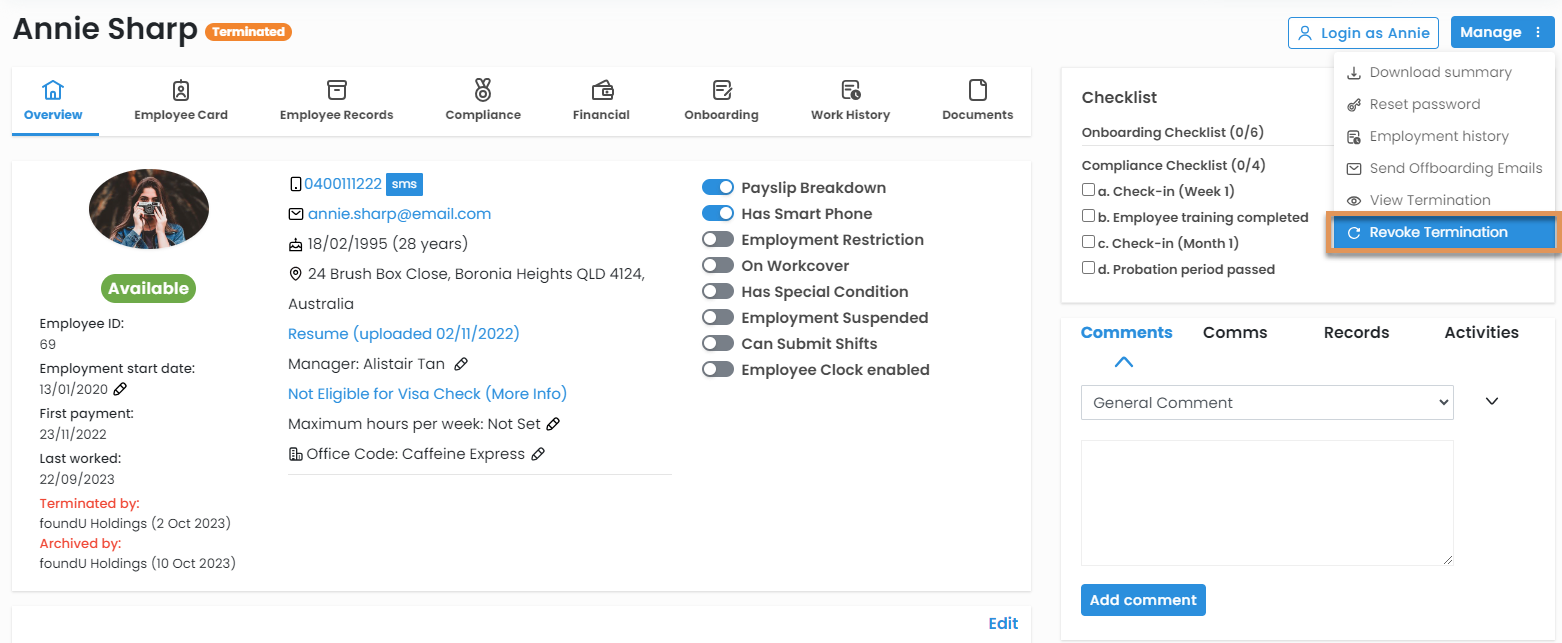 Select Manage > Revoke Termination.