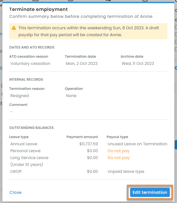 Select Edit termination to make changes. You will be taken through the steps from the beginning, allowing you to make your amendments where necessary.
