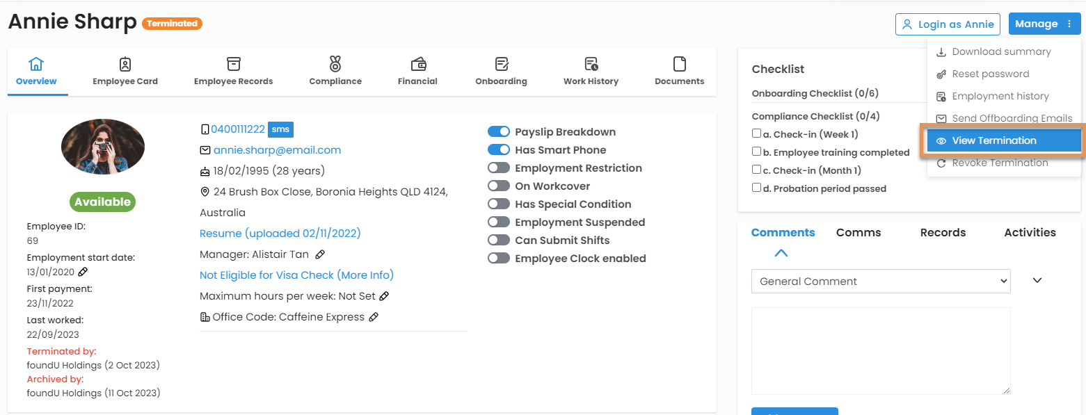 - Navigate to the Employee Profile and select Manage > View Termination.