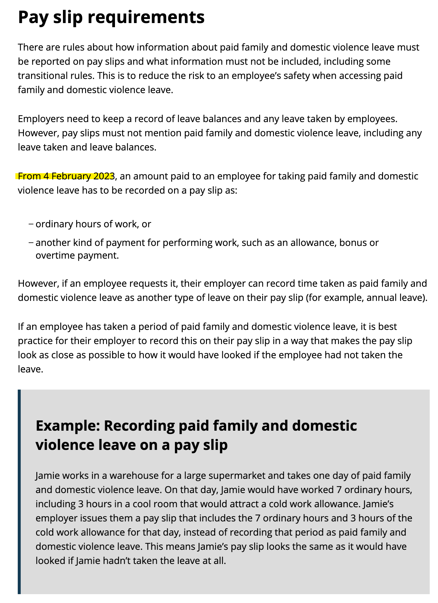 Warning: It is required that no evidence of Family and Domestic Violence leave should be reported as per the payslip requirements to reduce the risk to an employee’s safety when accessing paid Family and Domestic Violence leave.