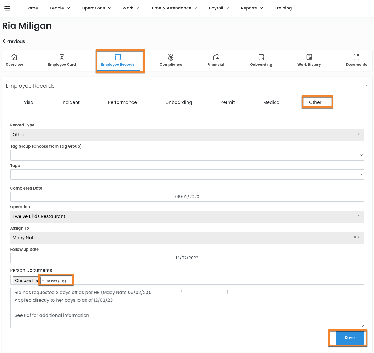 Tip: The visibility on this page is restricted by the permission 'Access employee records'. Employees cannot see these records, however, please consider the employee's privacy with any notes you make here.
