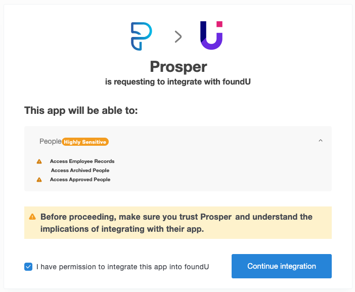 Accept Permissions by ticking the box and pressing Continue Integration.