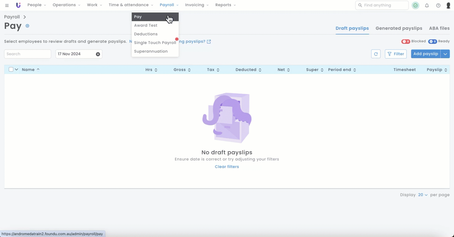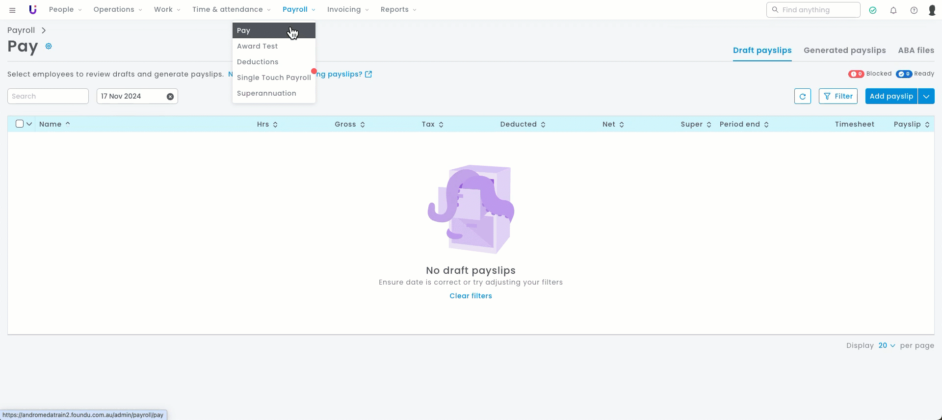 - Navigate to Payroll > Pay and locate the new Draft payslip that would have been created upon leave approval.