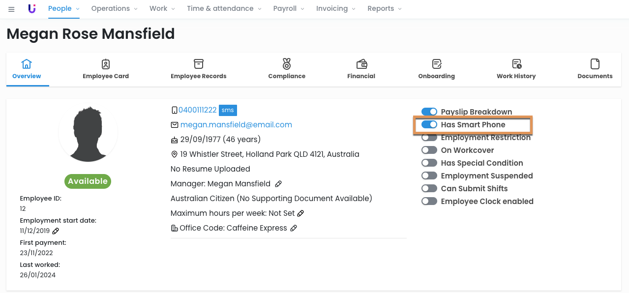 Employees have the 'Has Smart Phone' toggle enabled on their profile. (This is on for all new employees by default but can be turned on for individuals if previously turned off).