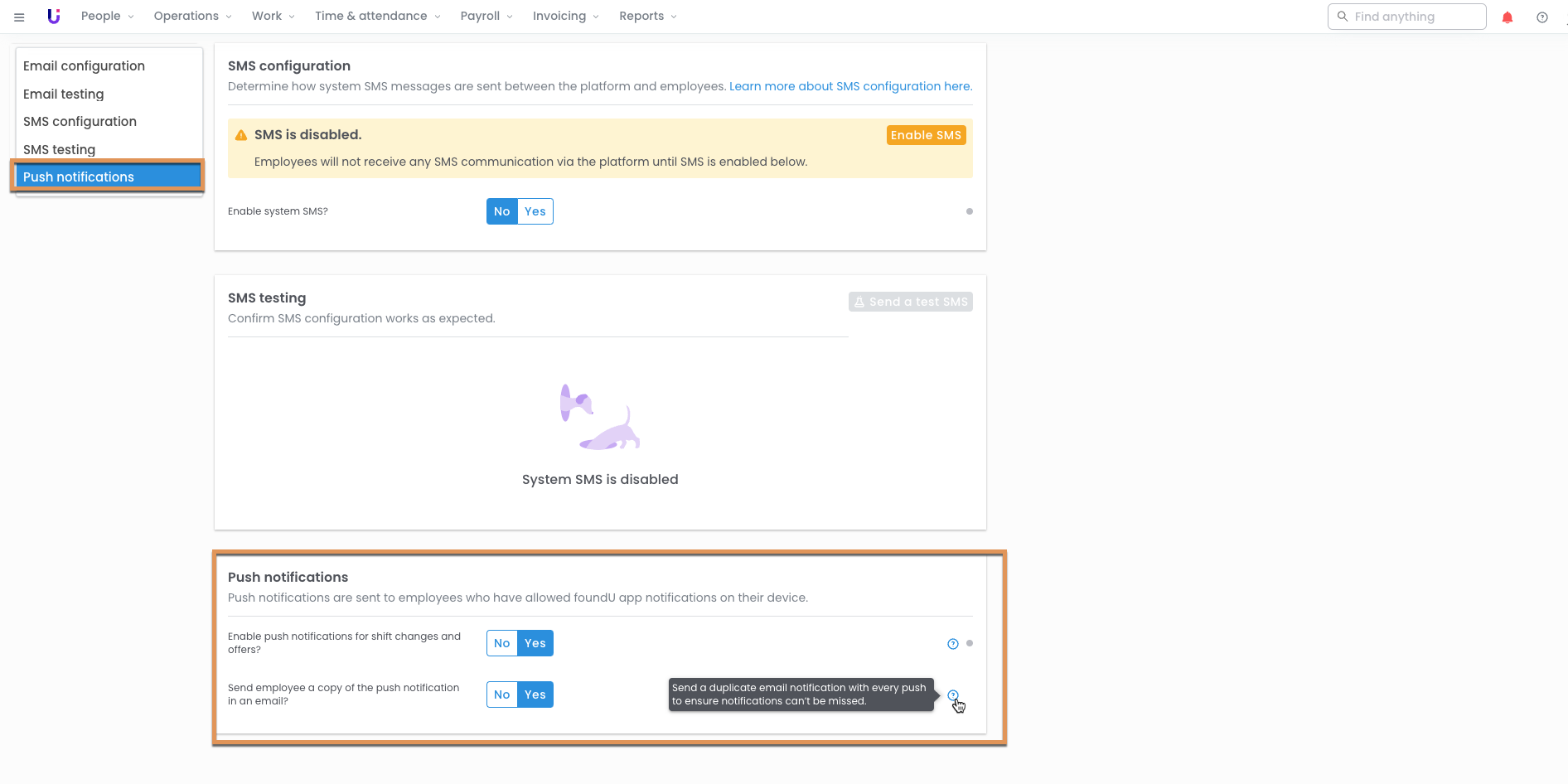 Hot tip: If you are just switching over to push notifications, you might like to enable this second setting for at least a short period until your employees get used to push notifications. It will send a duplicate email notification with every push to ensure notifications aren’t missed!