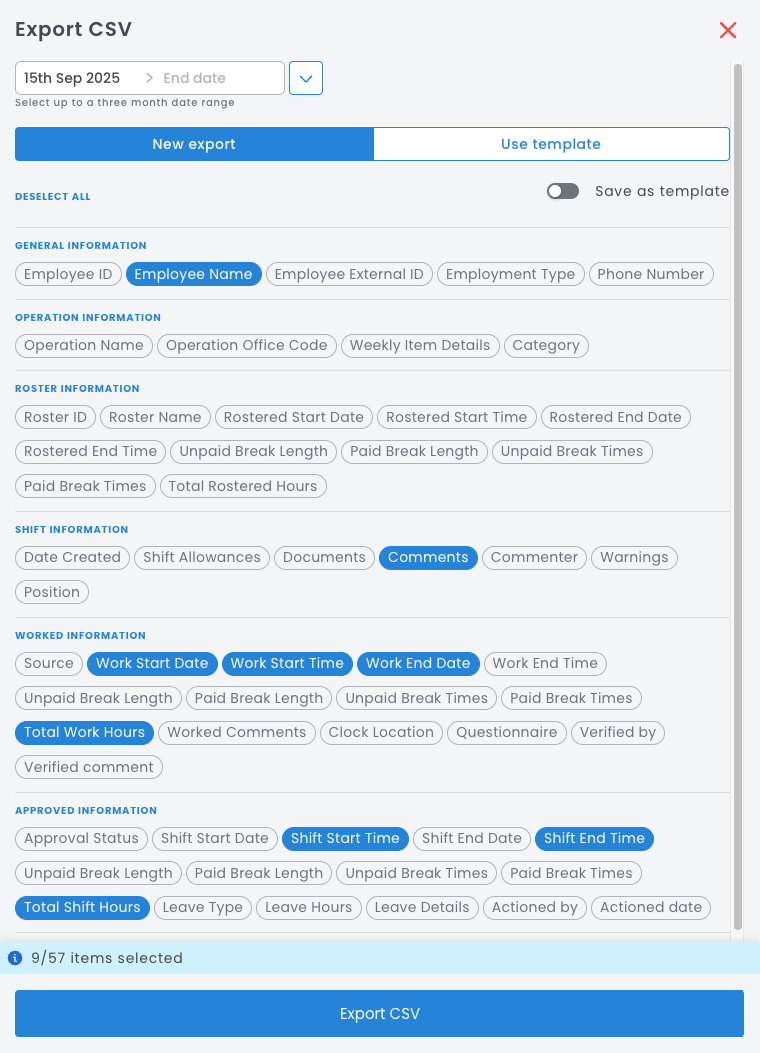 Approve Shifts Export - This export report is widely used and extremely useful as it allows for easy comparison between approved shifts and clock time duration. This report helps you quickly identify any shifts that have not had their approved end times edited.