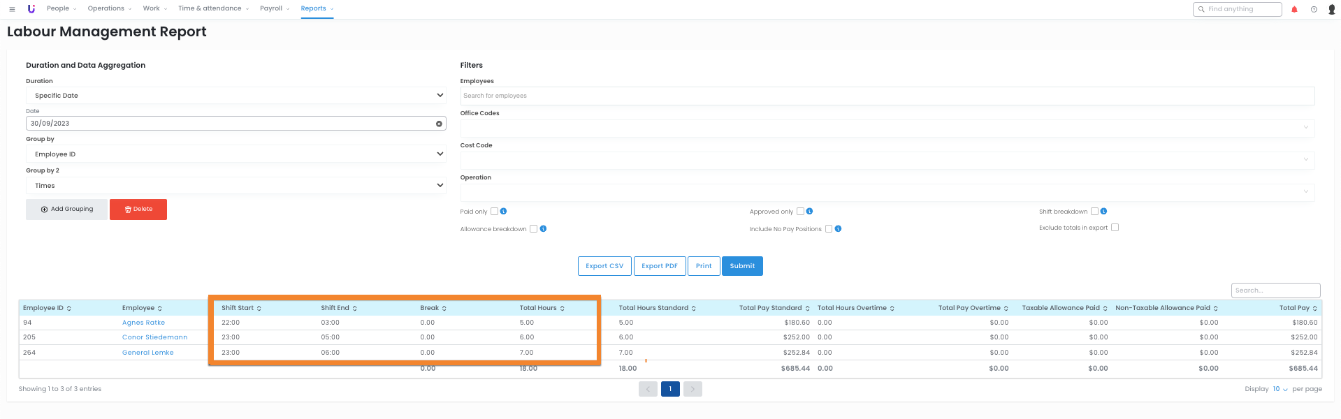 Below are a few reports that can help you check the total number of hours worked during these shifts: