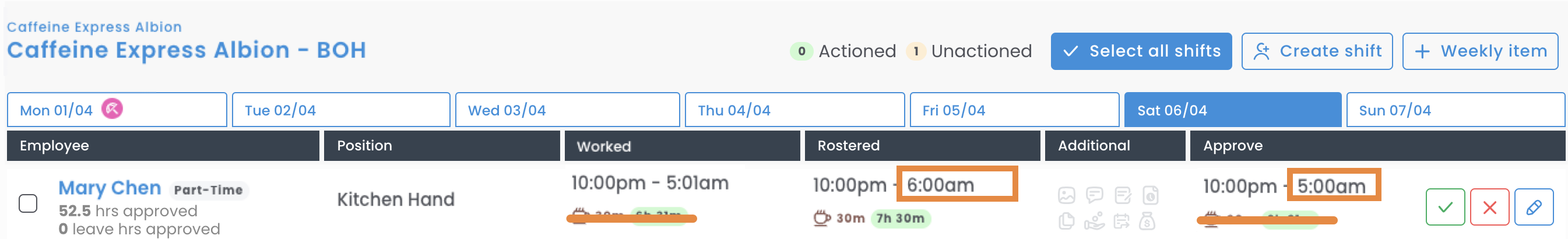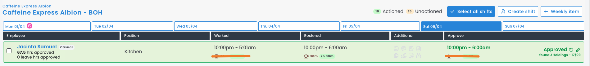 In the example below, the employee has clocked 10 pm - 5 am (a 1-hour change due to DST), and the system has pulled through the rostered times; no edit is required.