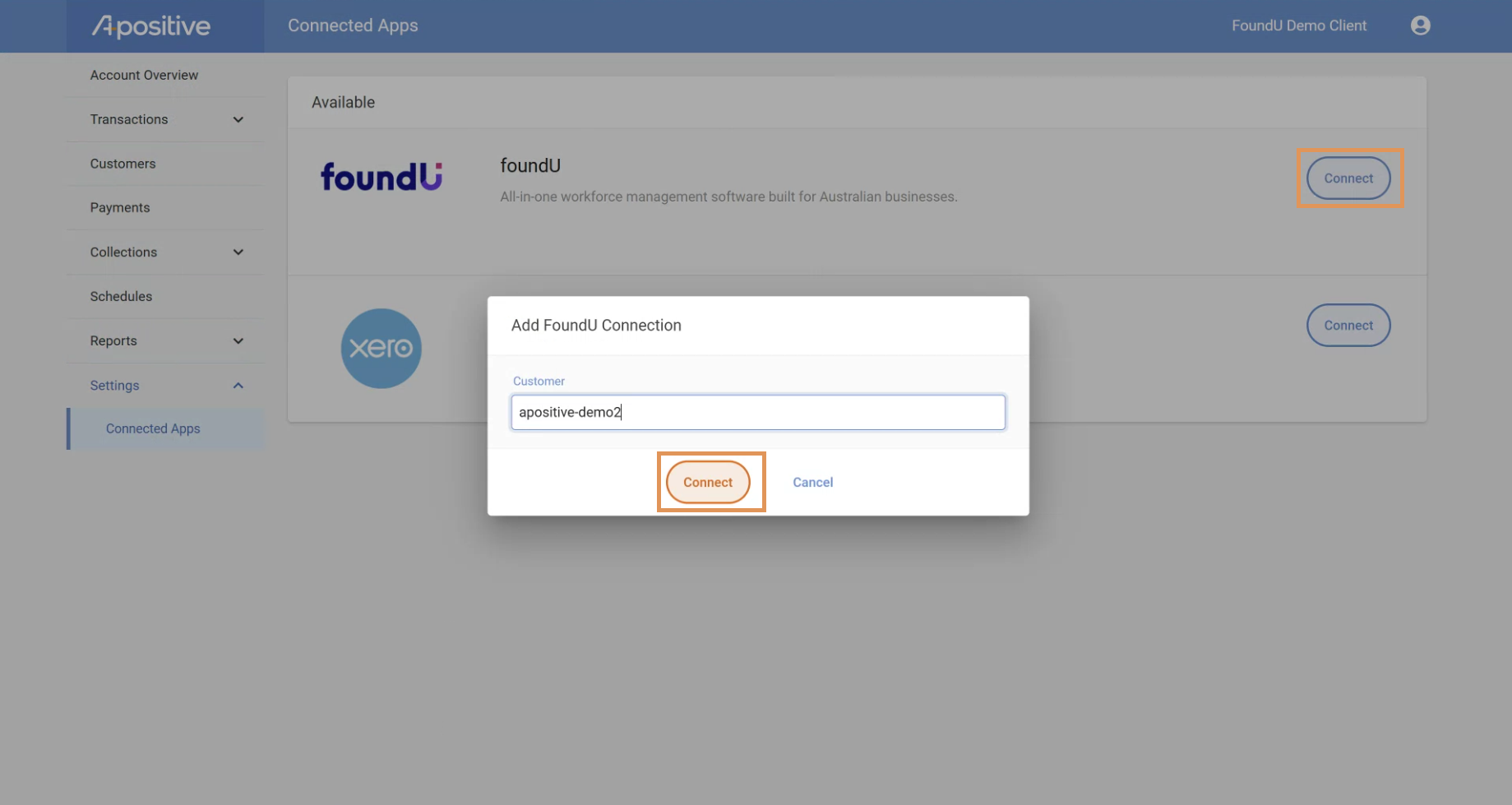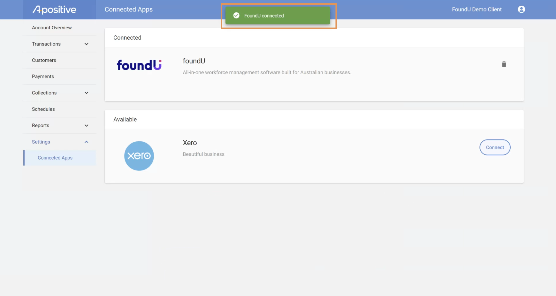 - Log in to your APositive Client Portal, then navigate to Settings > Connected Apps.