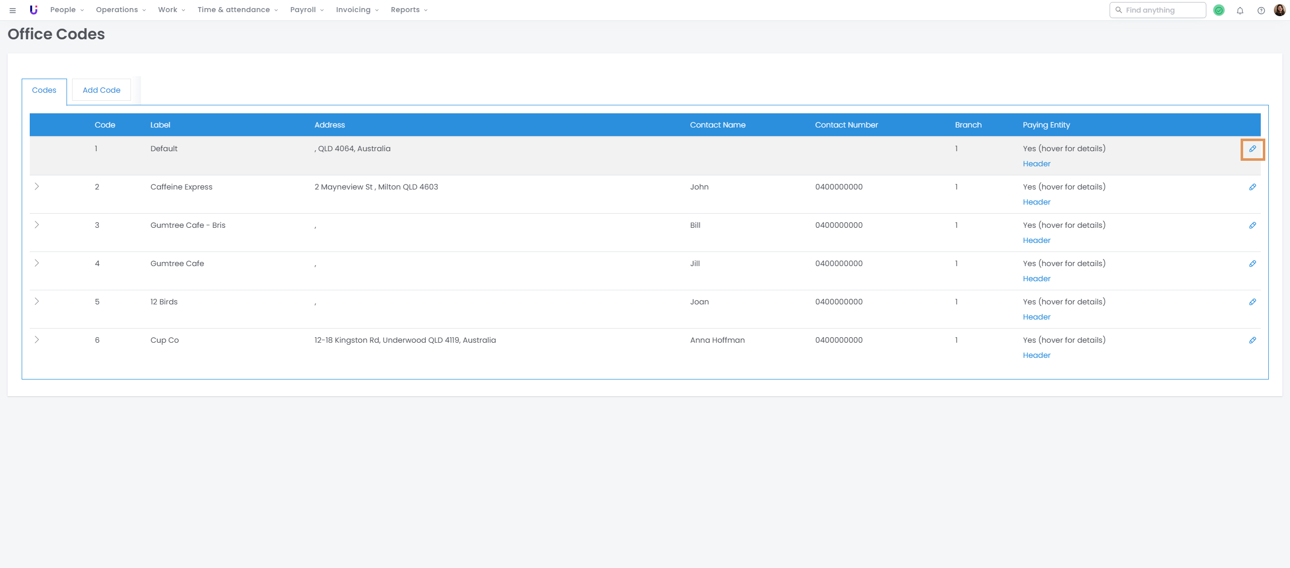 Navigate to the Office Code relevant to the entity you are integrating with APositive. This should be the same billing entity that your Invoice Finance account is for, and select the pencil to edit.
