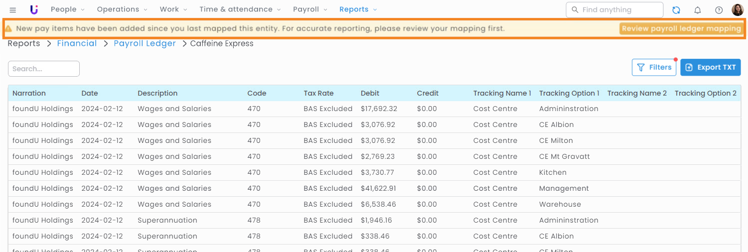 Hot tip: If there are any new or unmapped payroll items, a warning will appear at the top of your report. Allowing you to navigate back to your Mapping and review those items seamlessly.