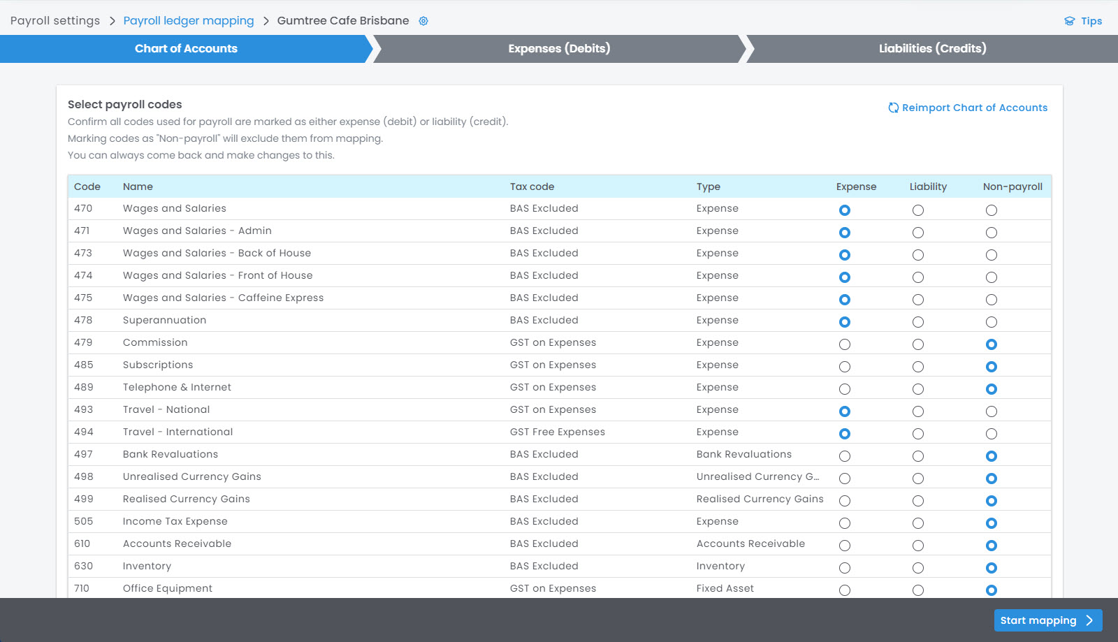 - The mapping tool will have pre-selected the codes that are marked as Expenses or Liabilities. Everything else will be marked as Non-payroll.