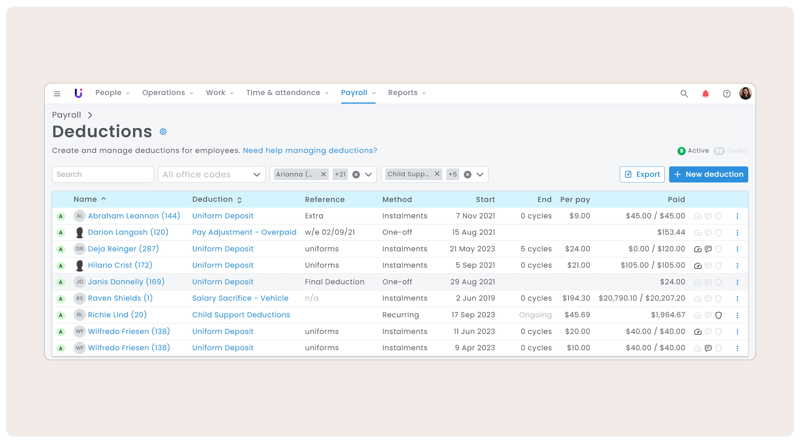 - More Control: Manage deductions for employees in bulk, set start and end dates for deductions, easily track one-off and recurring deductions, and easily view active or ended deductions.
