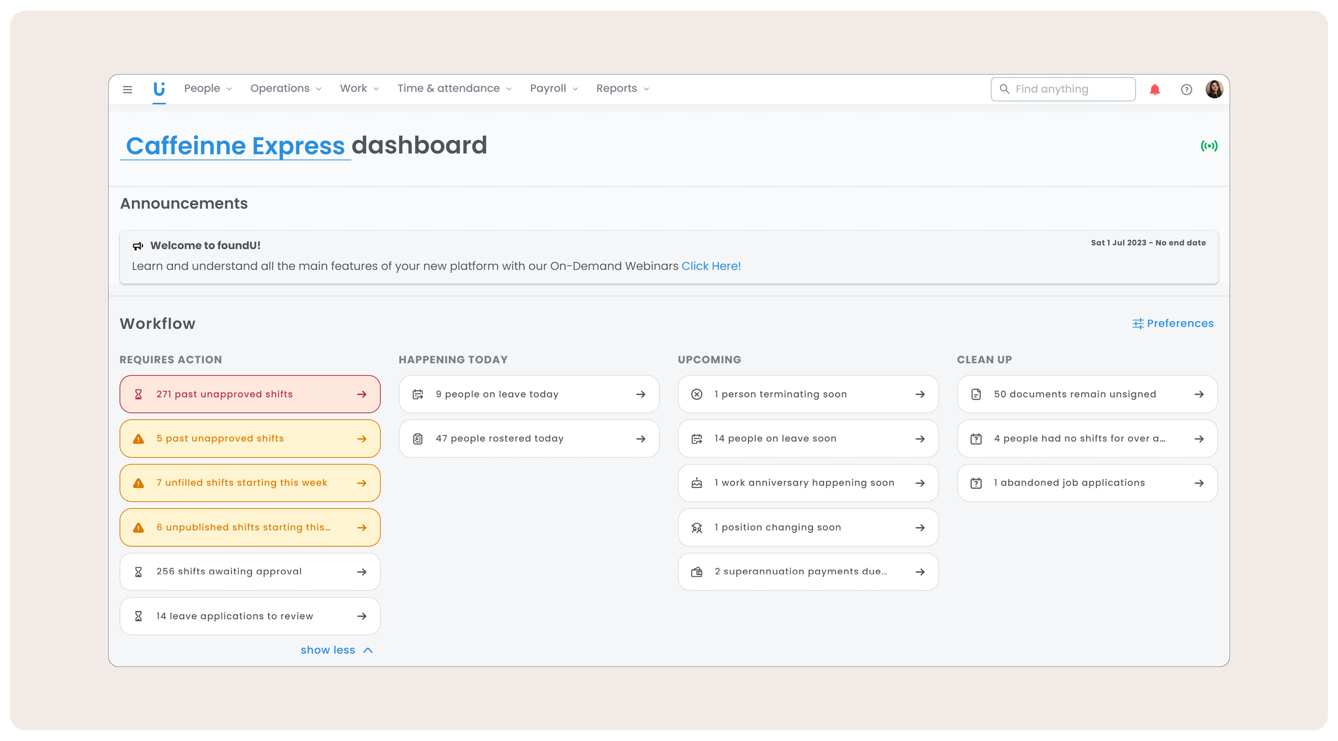 - Tasks Requiring Action: Such as approving shifts, outstanding STP submissions.