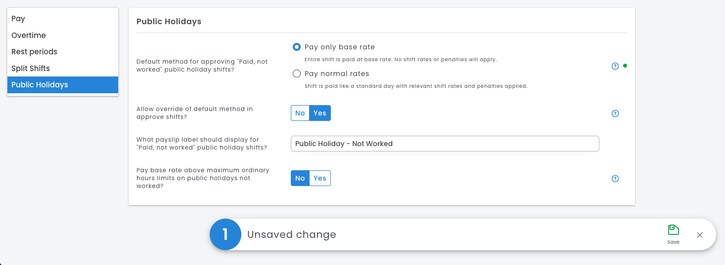 New Public Holiday Award Settings