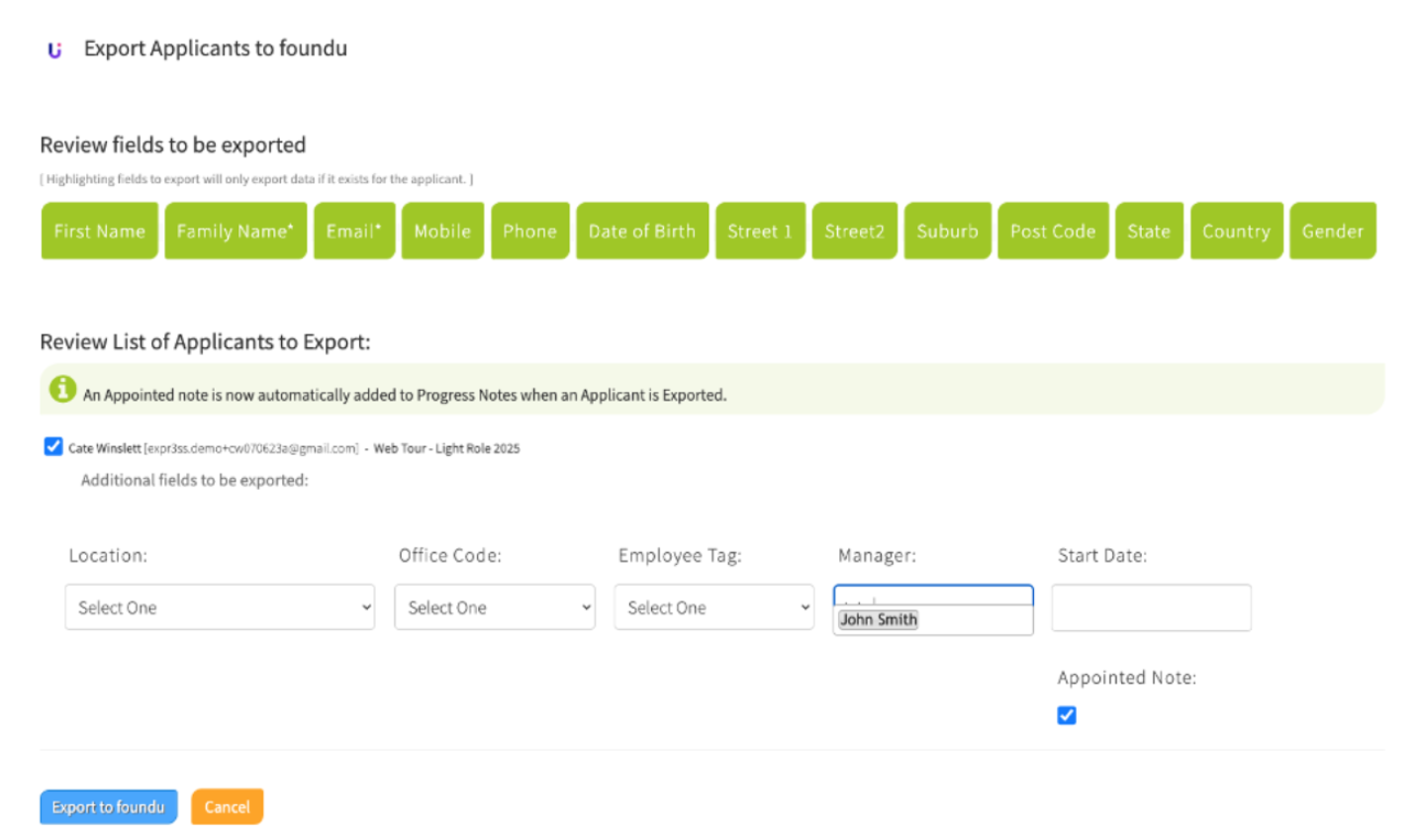- The Hiring Manager can then ensure fields such as Manager, Office Code etc. are completed and then export import applicants into foundU.