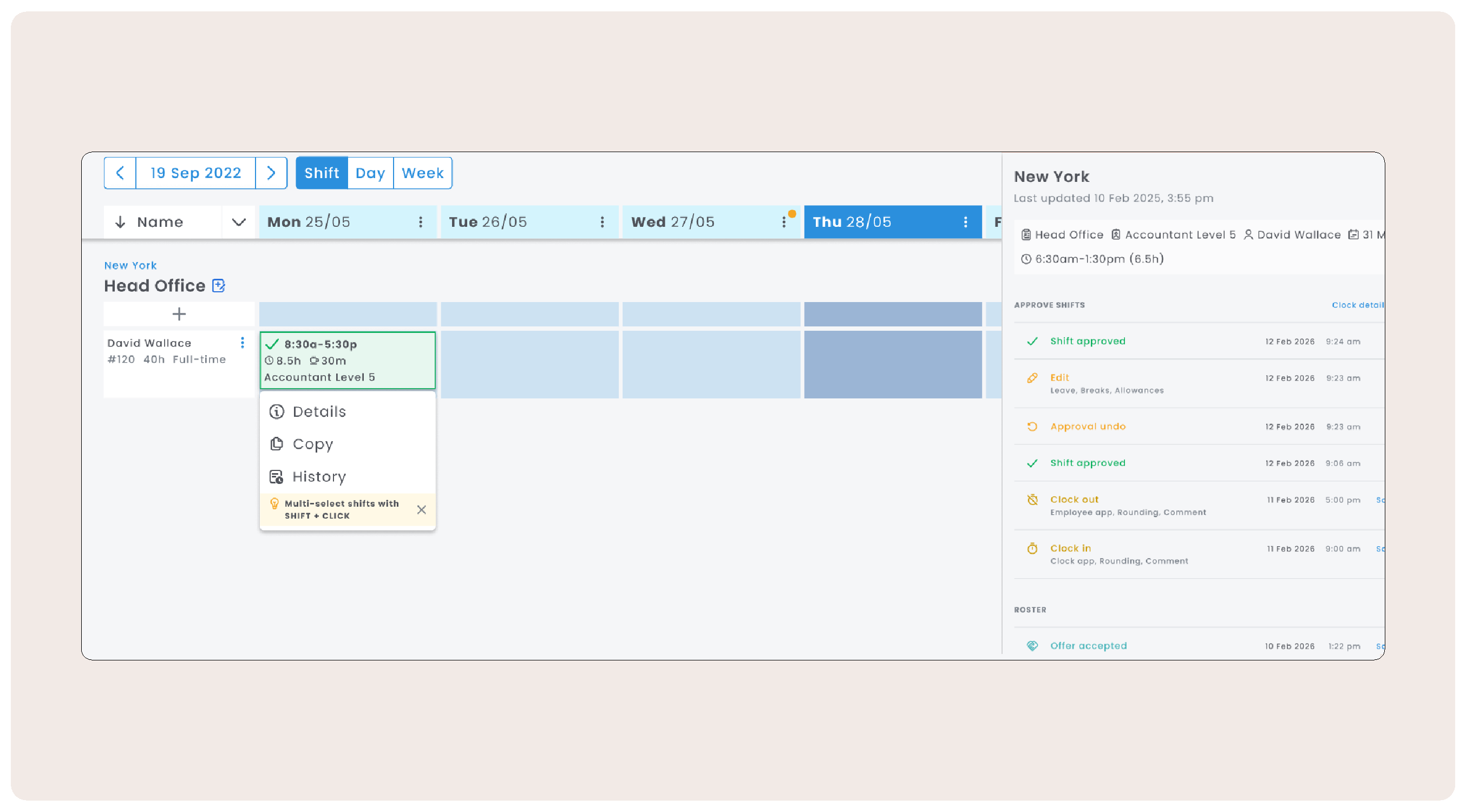 Shift History: Track actions against a shift from the Roster and Approve Shifts views.