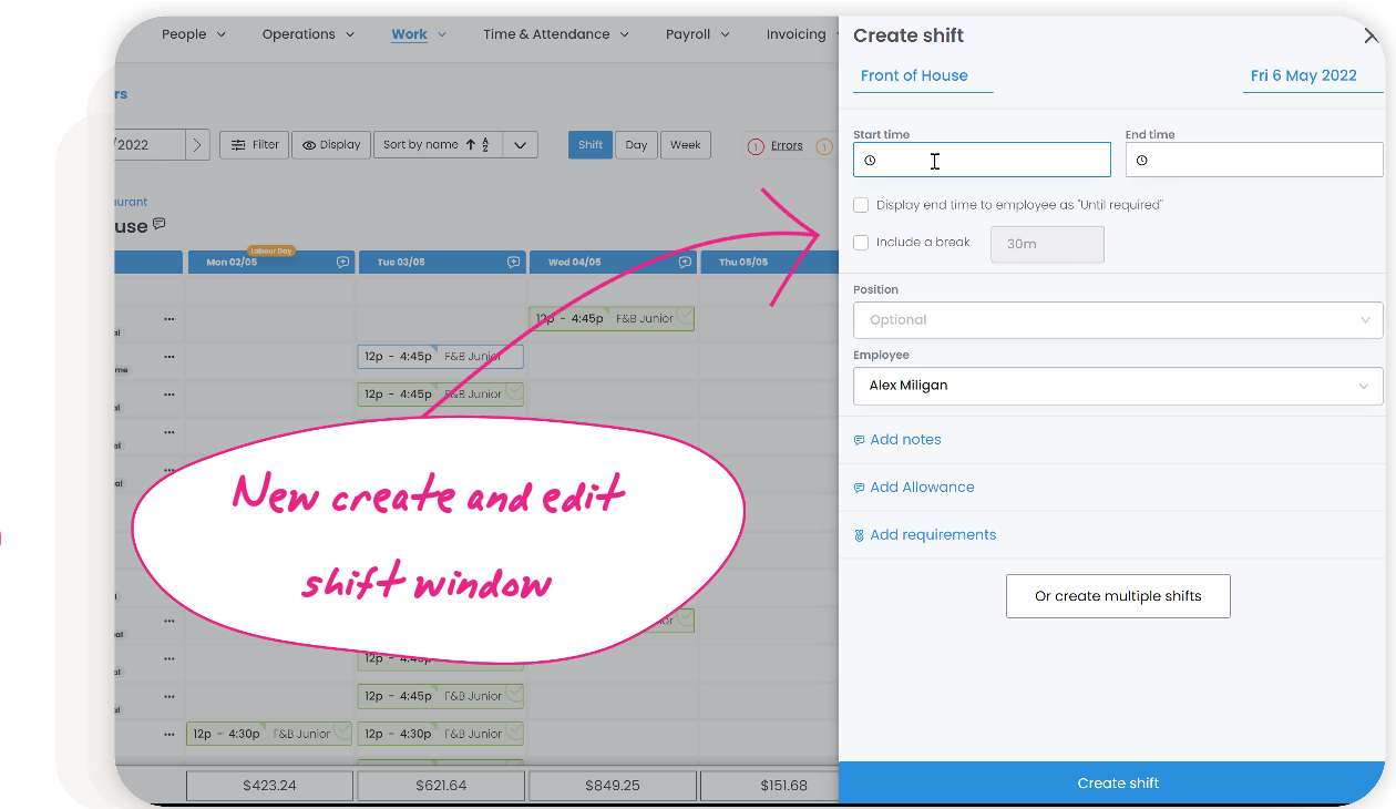 Now when you create or edit a shift on the roster, you'll notice a new window. It's a friendlier experience and it's much easier to see the shift details as you add them. Enjoy!