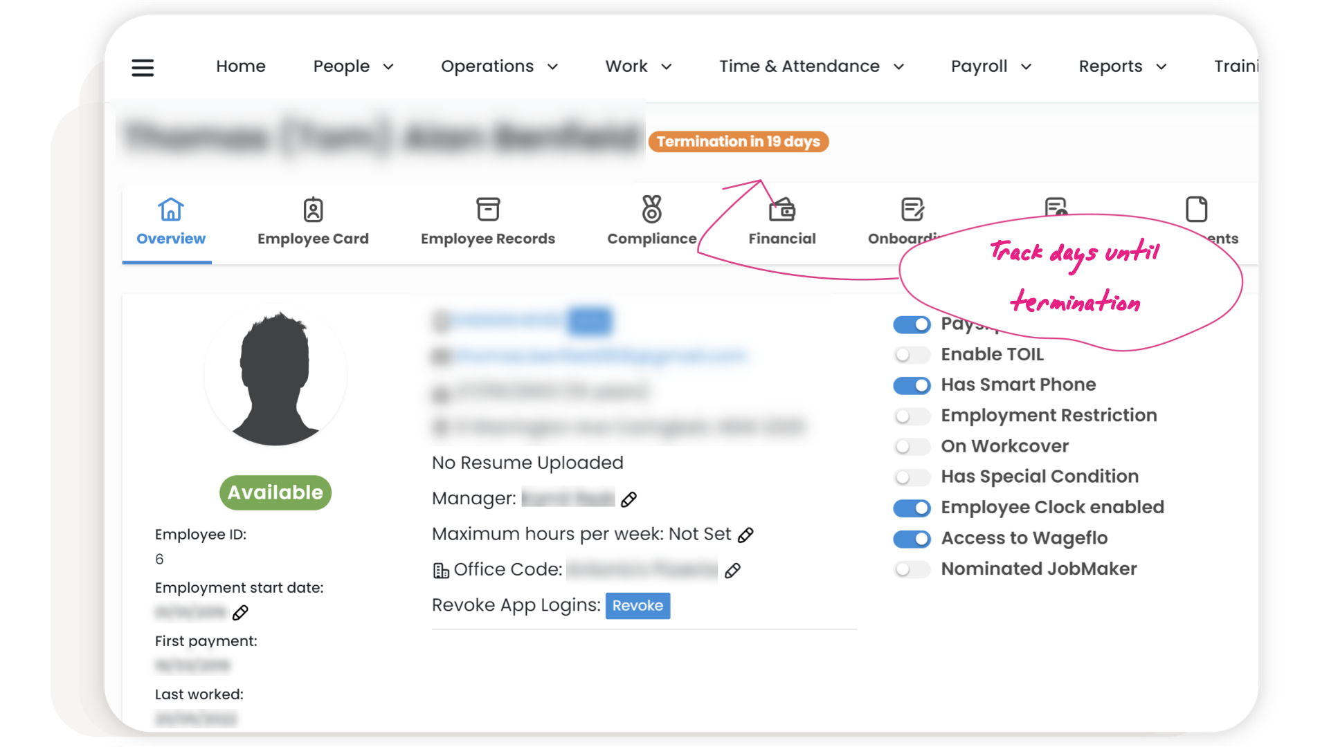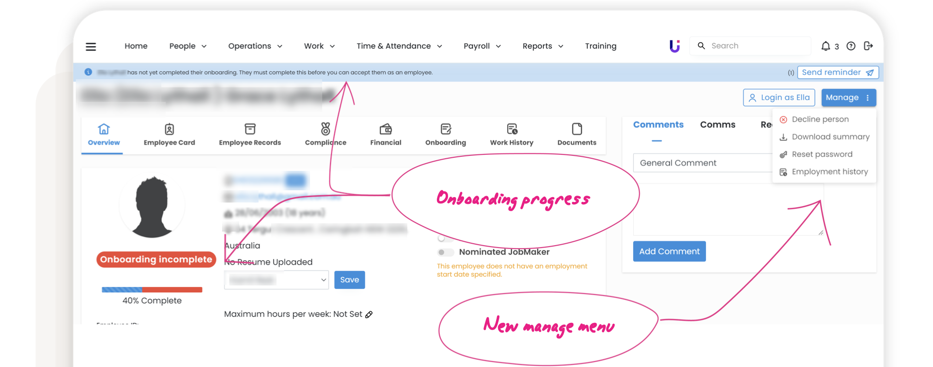 New 'Manage' menu in the employee profile, bringing all of the actions you need together in an easy-access location
