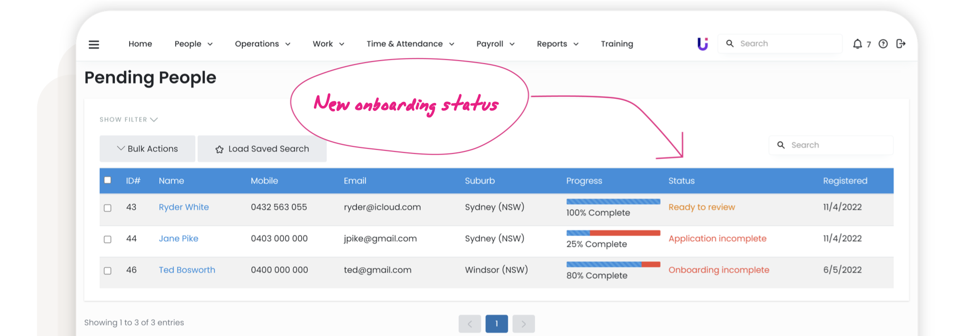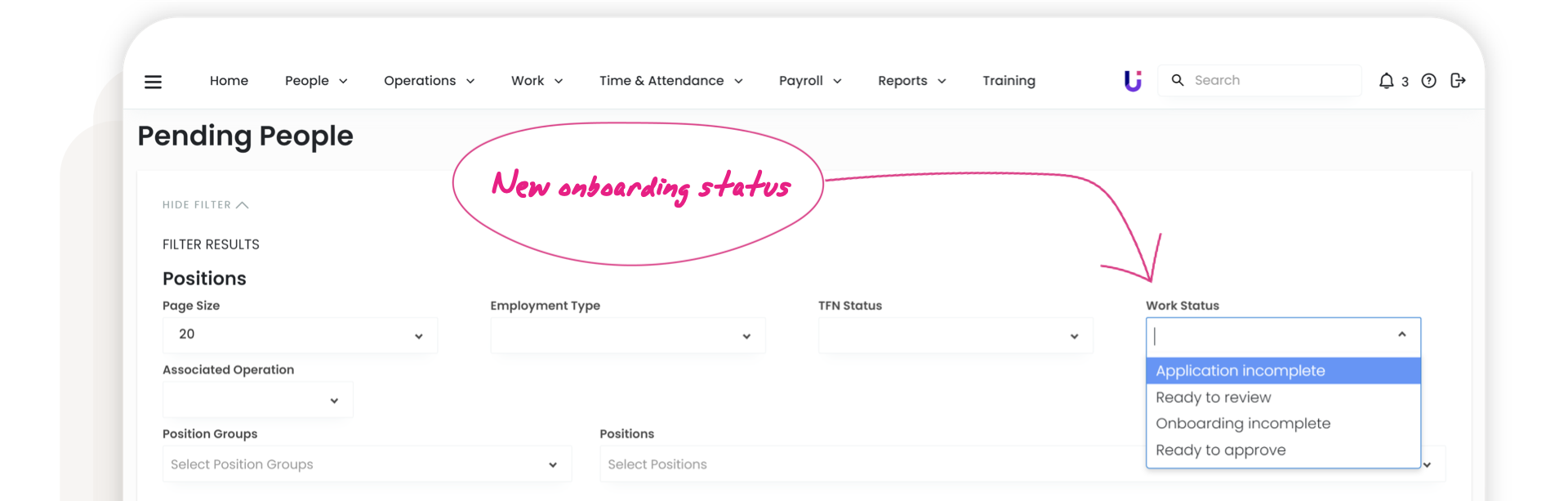 Smarter 'Work Status' Filter. If you use the filter whilst in 'Pending People' it will now only show the new onboarding stages.