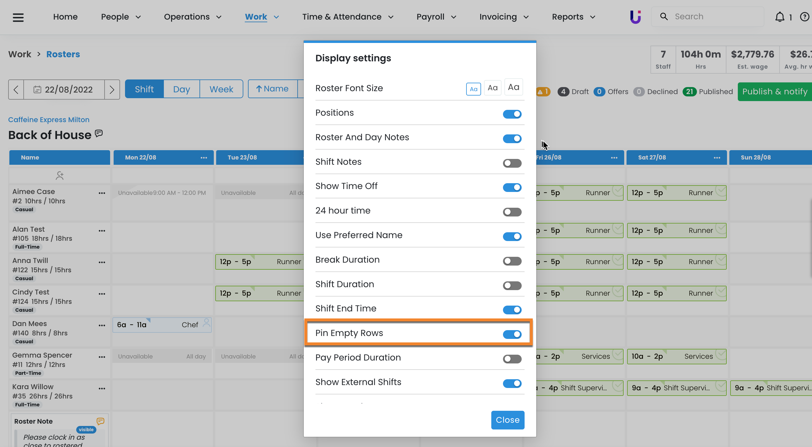 To set this up just change your 'Display Settings' and turn on the 'Pin Empty Rows' toggle. Then when you add employees, even if they have no shifts, they will remain on the roster.