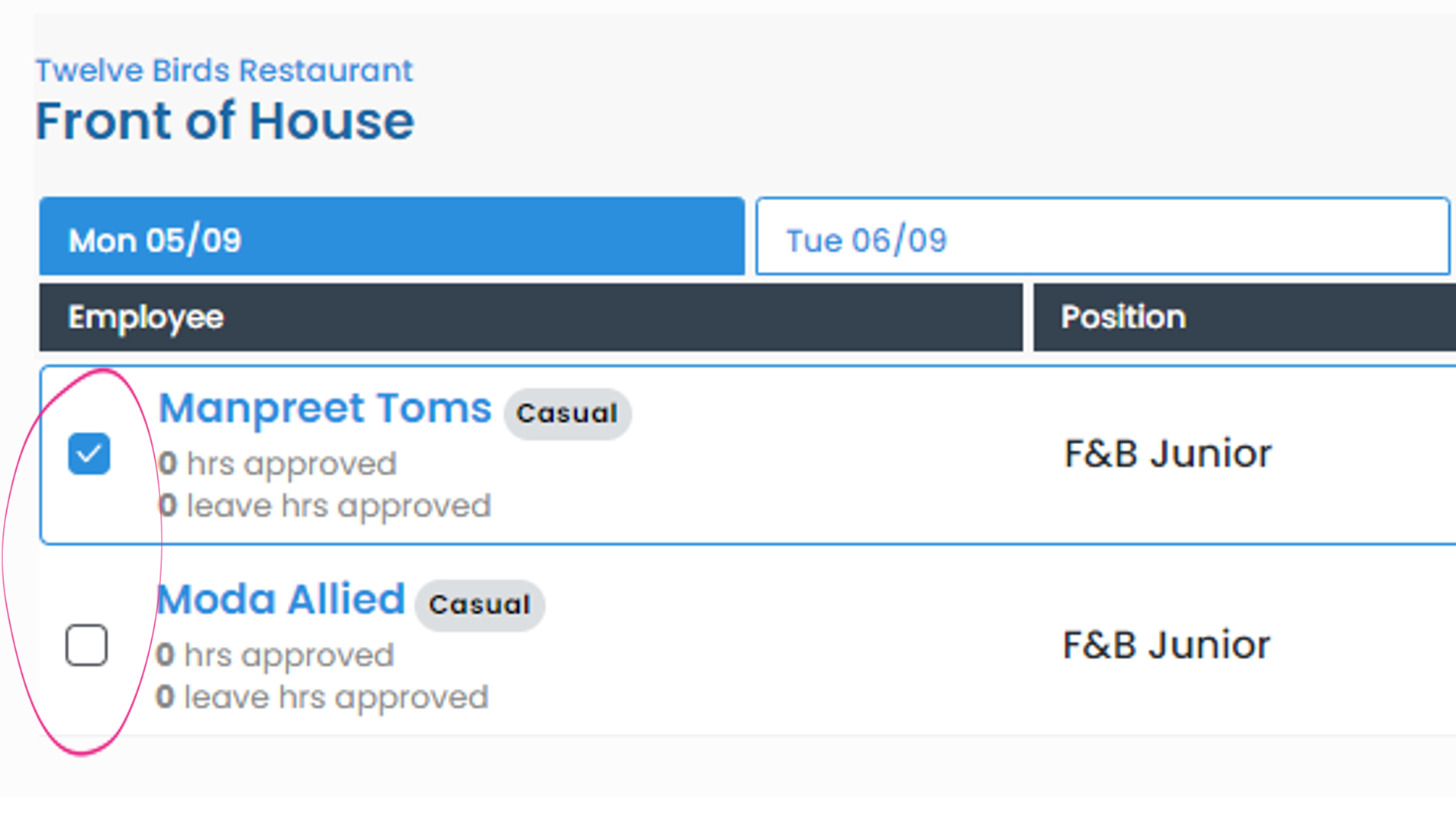 You can now select specific shifts to update using the checkbox to the left of the employee's name.