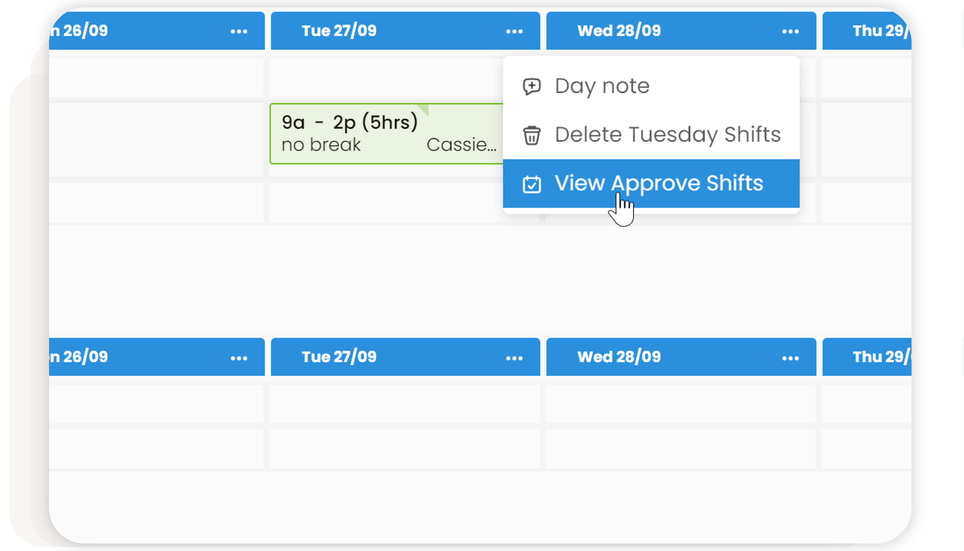 You can now click 'View Approve Shifts' on any day (the 3 dots to the right of the day/date) on your roster to take you straight to the corresponding day within Approve Shifts, where you can update shifts immediately.