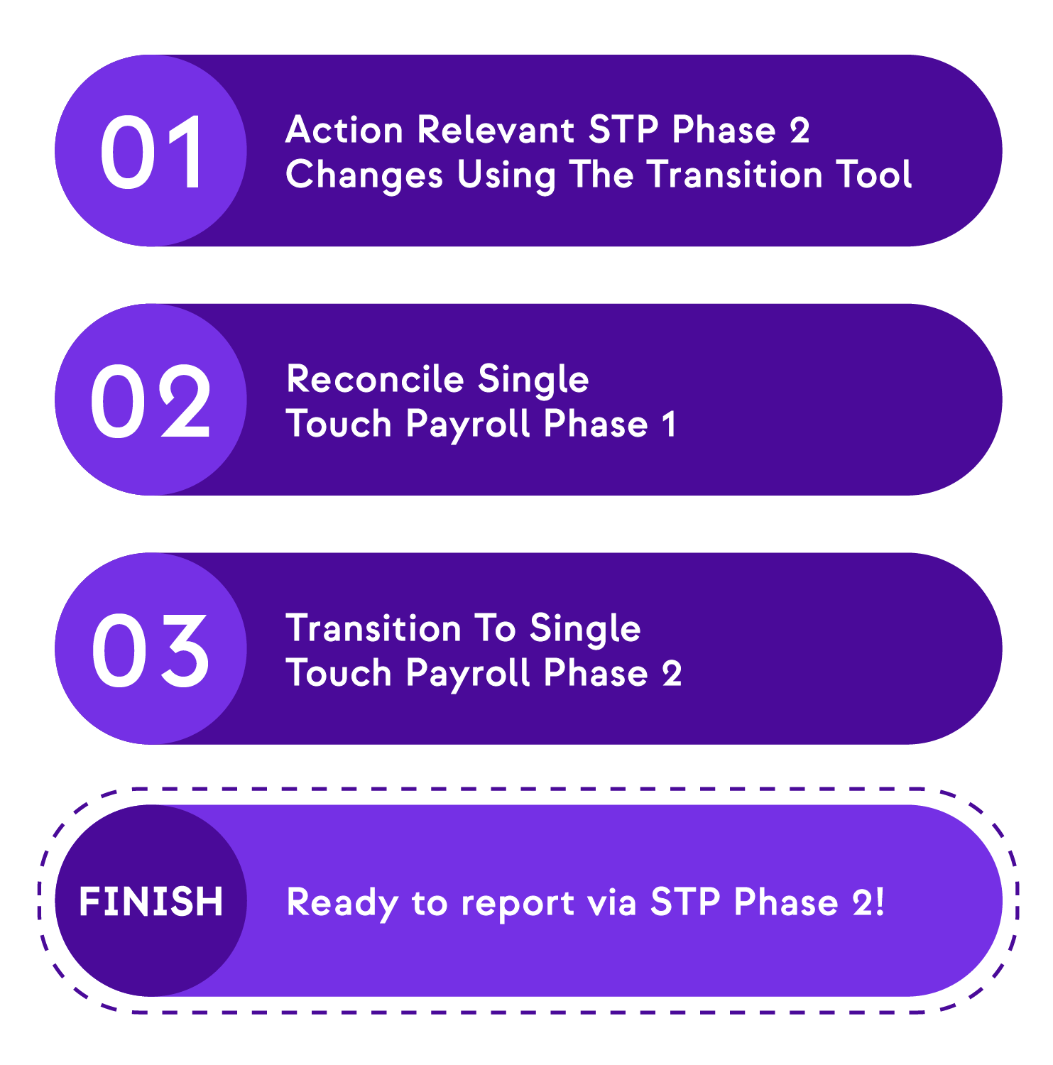 Once you have completed the first step of completing the transition tool tasks, wait to hear from us. We'll let you know when the time is right to reconcile your STP Phase 1 payroll before making the big switch to STP Phase 2!