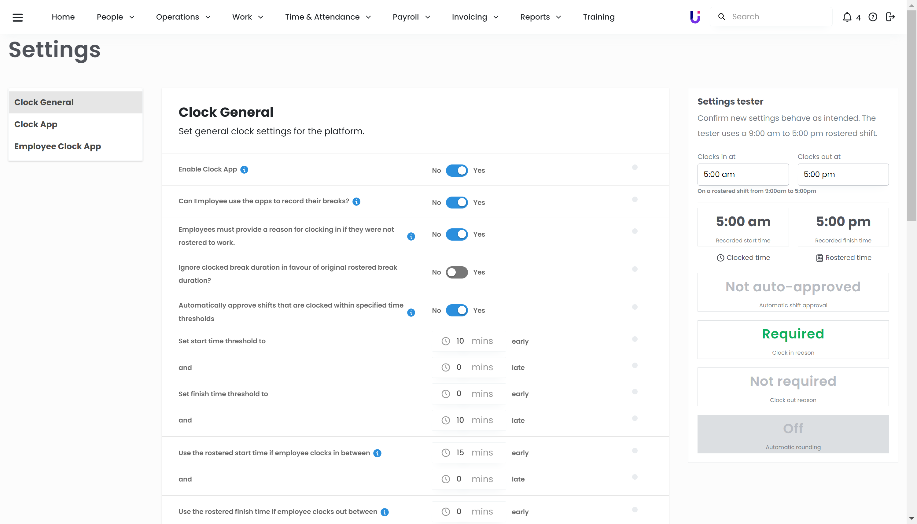 When adjusting settings for Clock, there is now a new Settings tester! Once you've adjusted your clock settings, use the tester on the right of the screen to enter in shift times and preview what clock will show to the employee. e.g. If they need to provide a reason for clocking in too early.