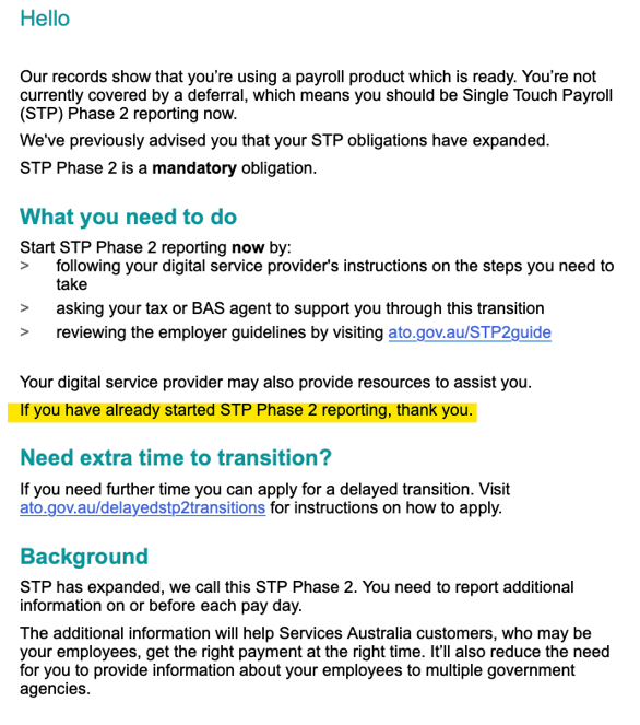 You may have received a "You should be Single Touch Payroll Payroll Phase 2 reporting" email from the Australian Taxation Office (ATO). Don't stress, that email is to basically let you know that foundU is compliant and we're all in the new world now. As per their disclaimer "If you have already started STP Phase 2 reporting, thank you."