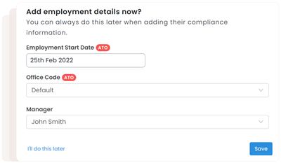 When approving new employees, you'll now be asked to assign a Manager, Office Code and set an Employment Start Date. You'll also need to set the Income Type for STP reporting purposes.