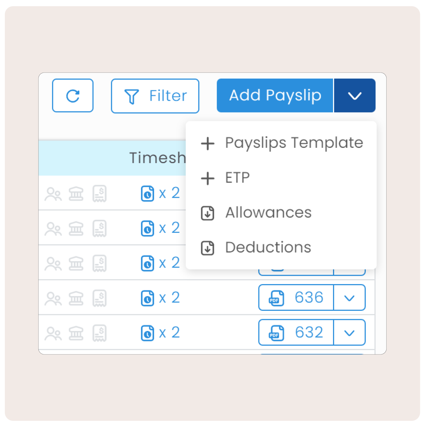 'Create new payslip' has been renamed to 'Add Payslip' with options: Payslip Template, ETP, Allowances and Deductions.