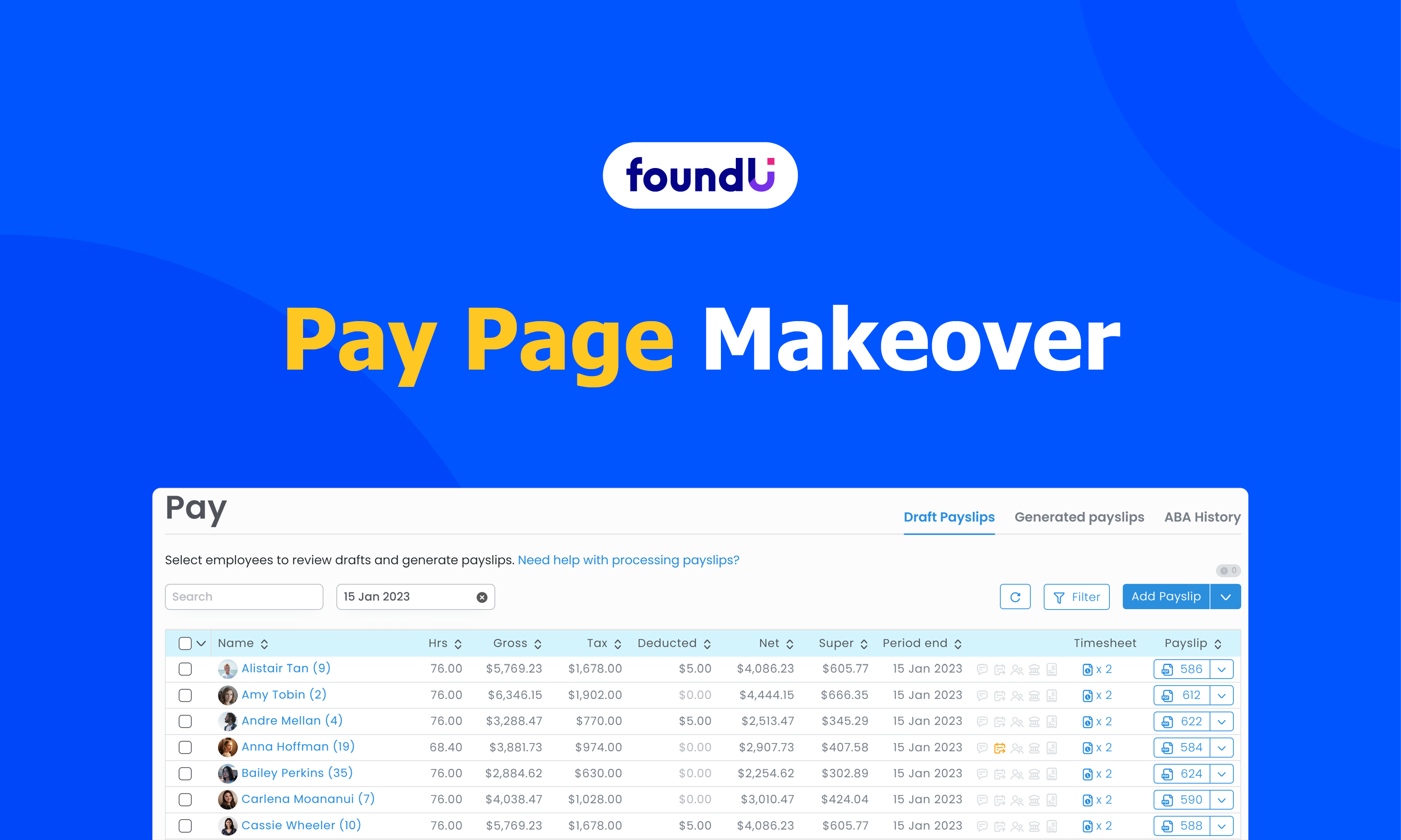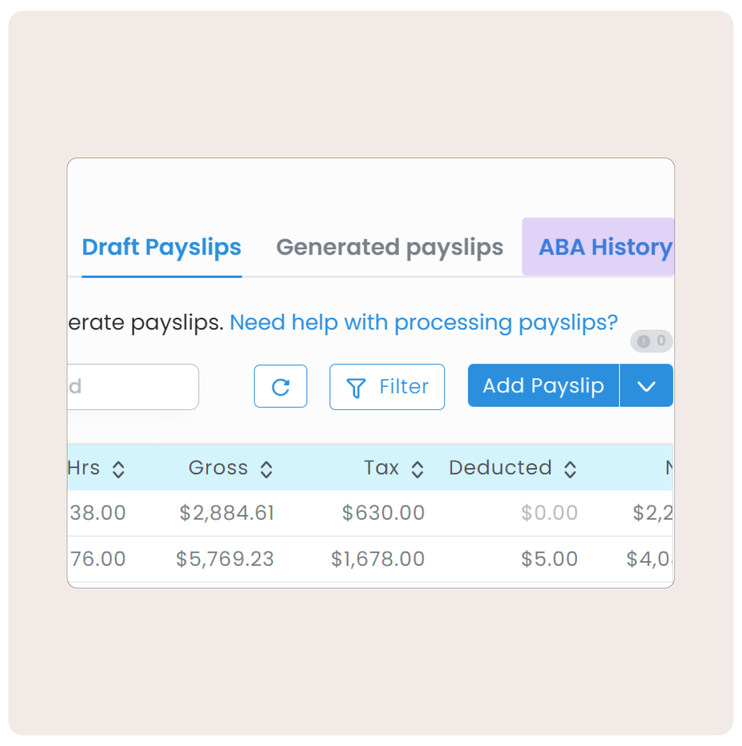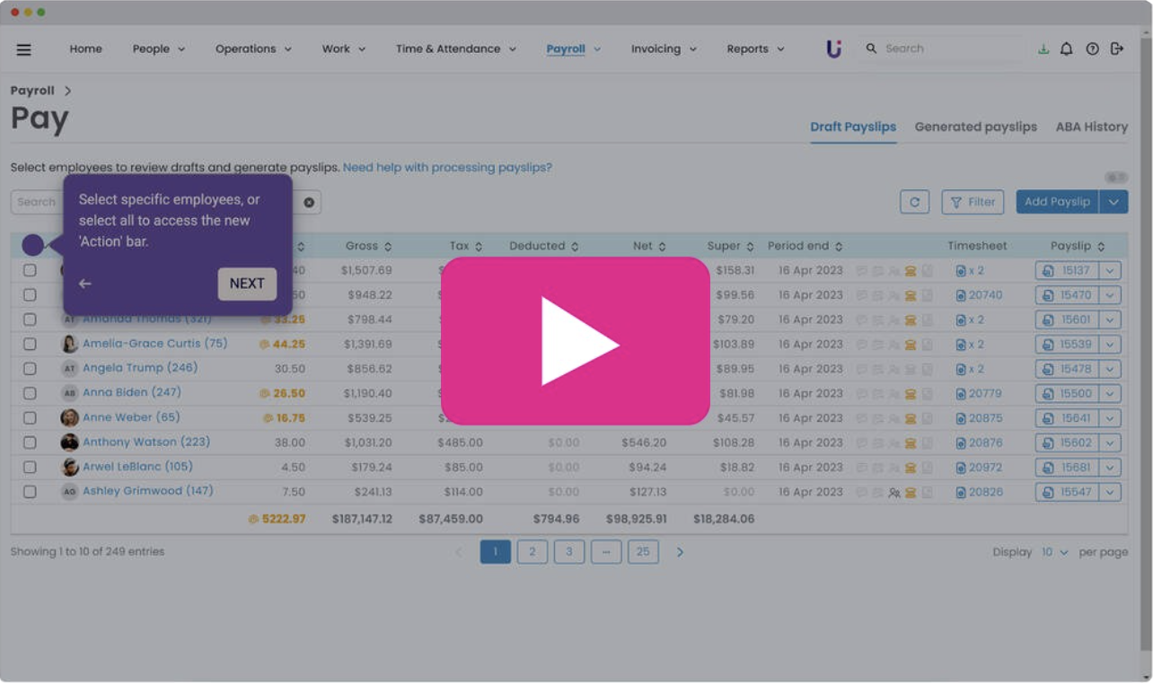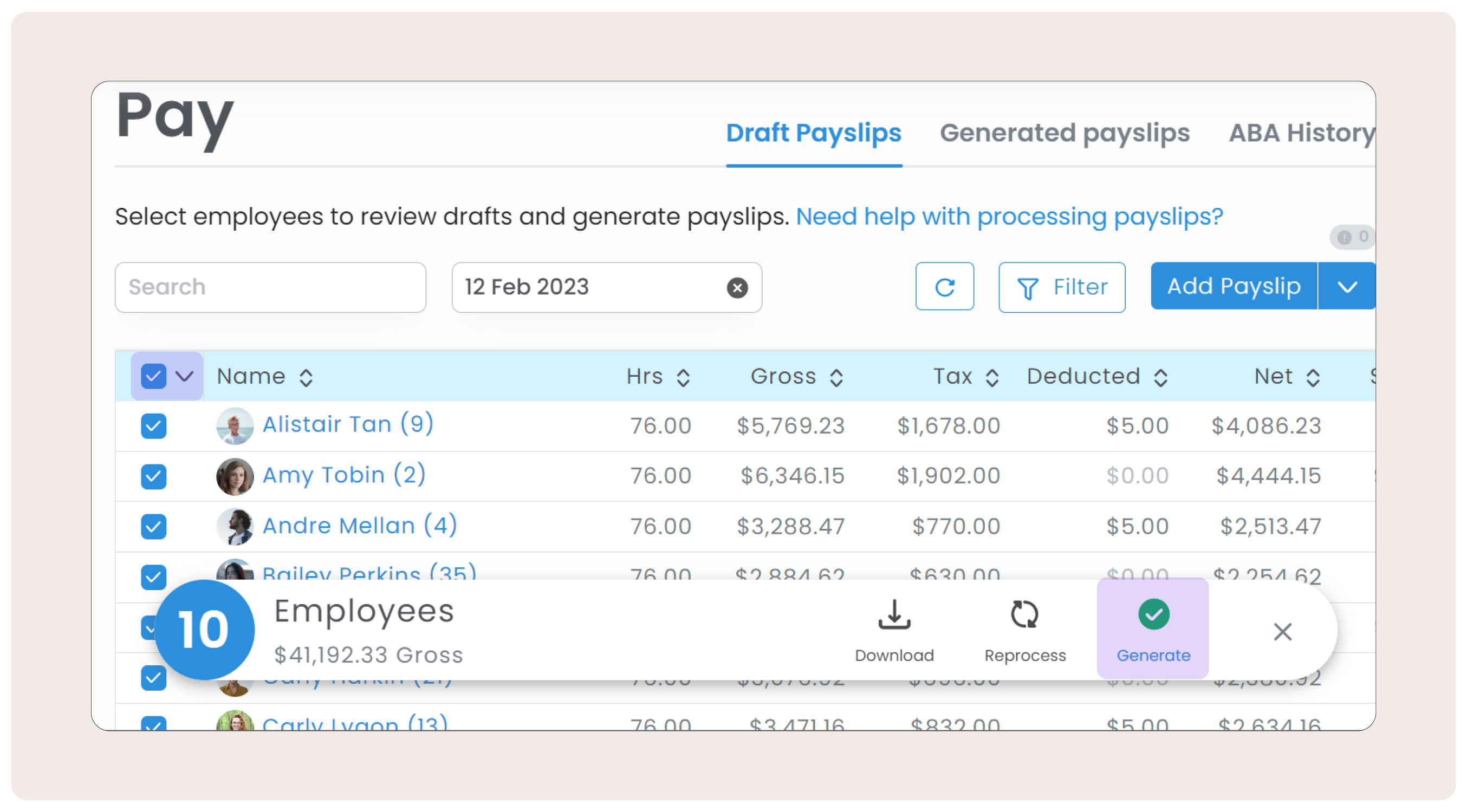 In the new look Draft Payslips page, the 'Generate Payslips' button has moved into a new Action bar. Simply select specific employees, or select all to access the button.