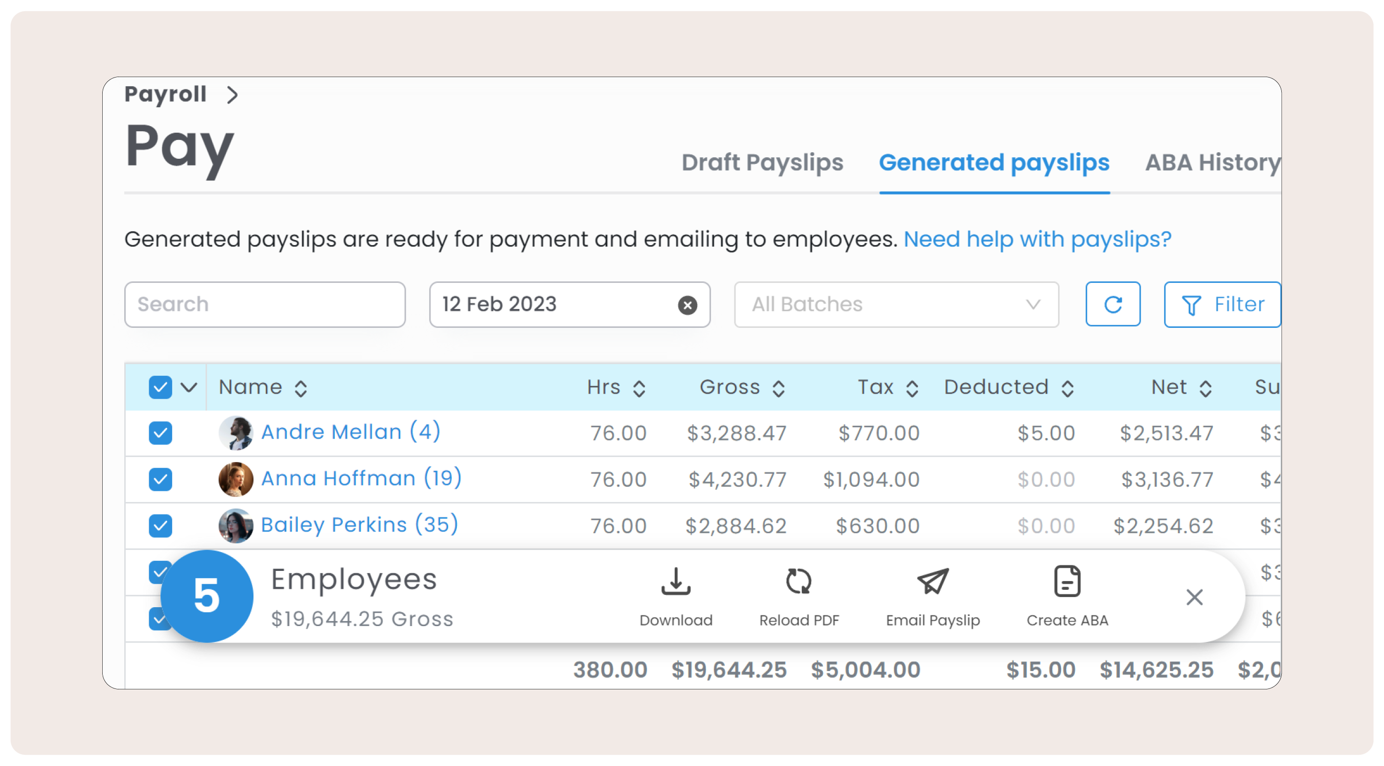In the new look Generated Payslips page, select specific or all employees to access the new Action bar to: