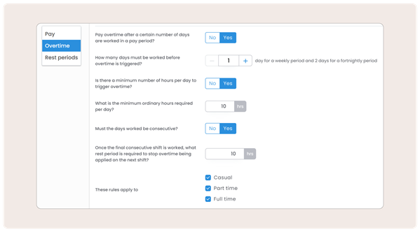There is now a new award setting to help specify how many days are worked in a period or consecutively before overtime is triggered.