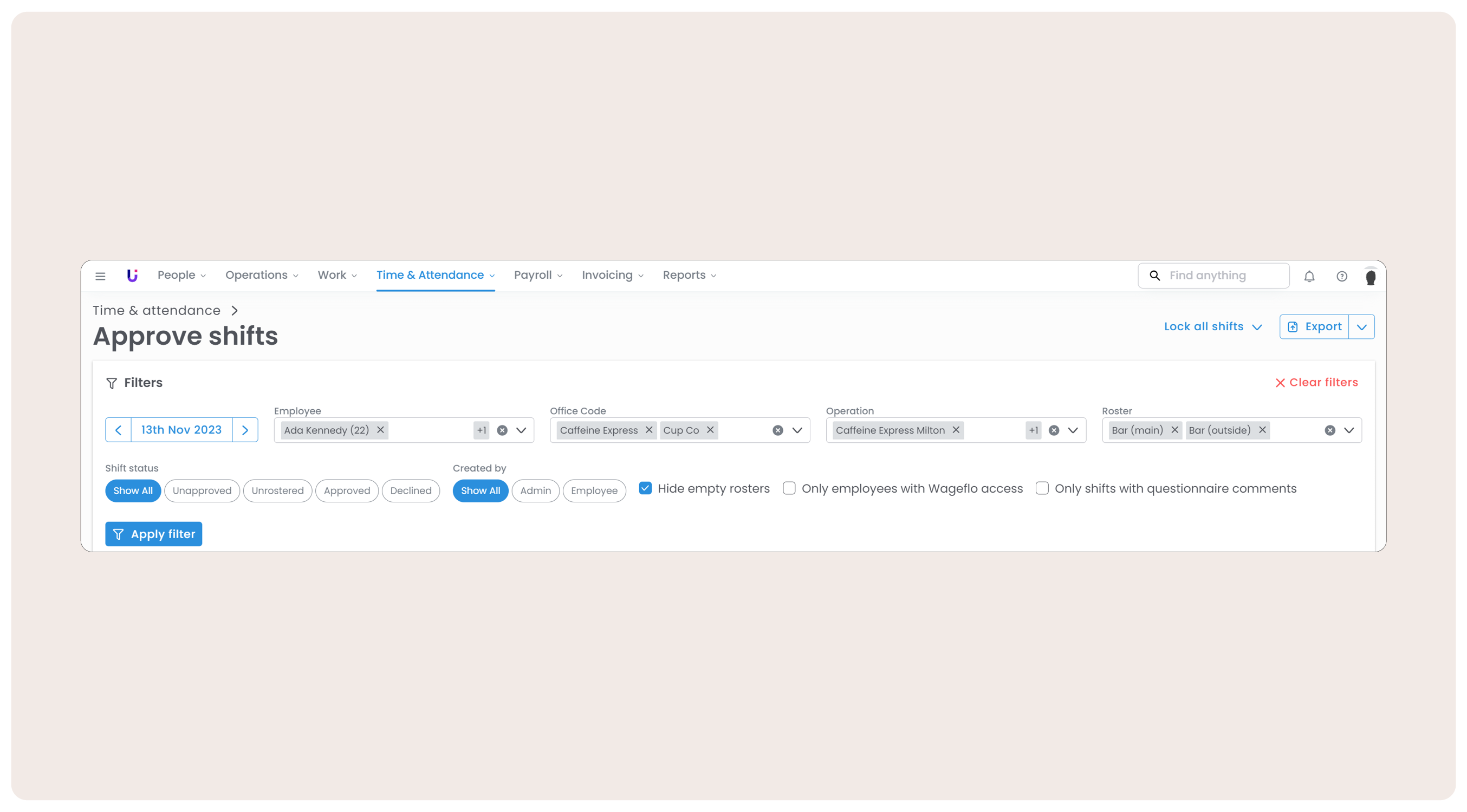 You can now select multiple options per filter when approving shifts! Also the 'Export' button has moved to the top right, and the date selector has been updated to reflect the calendar look in other areas of the platform.